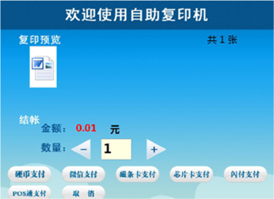 通过文件扫描、上传云端等技术实现身份证复印、文件复印、手机文件打印、U盘文件打印等功能,支持投币、微信、支付宝、云闪付等多种支付方式,可灵活的部署在商场、社区、工业园、办事大厅等有复印打印需求的场合。便民复印机操作简单,可以无人值守,24小时提供服务。