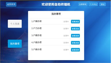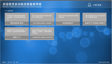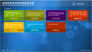 以整合“政务信息化”为基础,通过自助服务一体机,延伸“政务信息化”的服务内容和扩大覆盖范围,与现有的各政务系统做对接,实现身份认证、指纹采集、资料打印、无人自助导向服务、办事进度查询、政务公开宣传、各类缴费业务、材料自助收取流转等事项办理。根据不同单位的需求,政务自助机可以设置不同的业务功能,做到全程自助化。